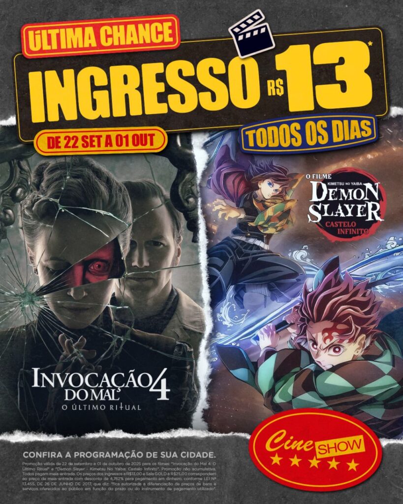 O Cine Show Volta Redonda preparou uma promoção especial para marcar a despedida de dois grandes sucessos de bilheteria. Até o dia 1º de outubro, os filmes “Invocação do Mal 4: O Último Ritual” e “Demon Slayer – Kimetsu No Yaiba: Castelo Infinito” estarão em cartaz pela última vez com ingressos a apenas R$13 em todos os dias.