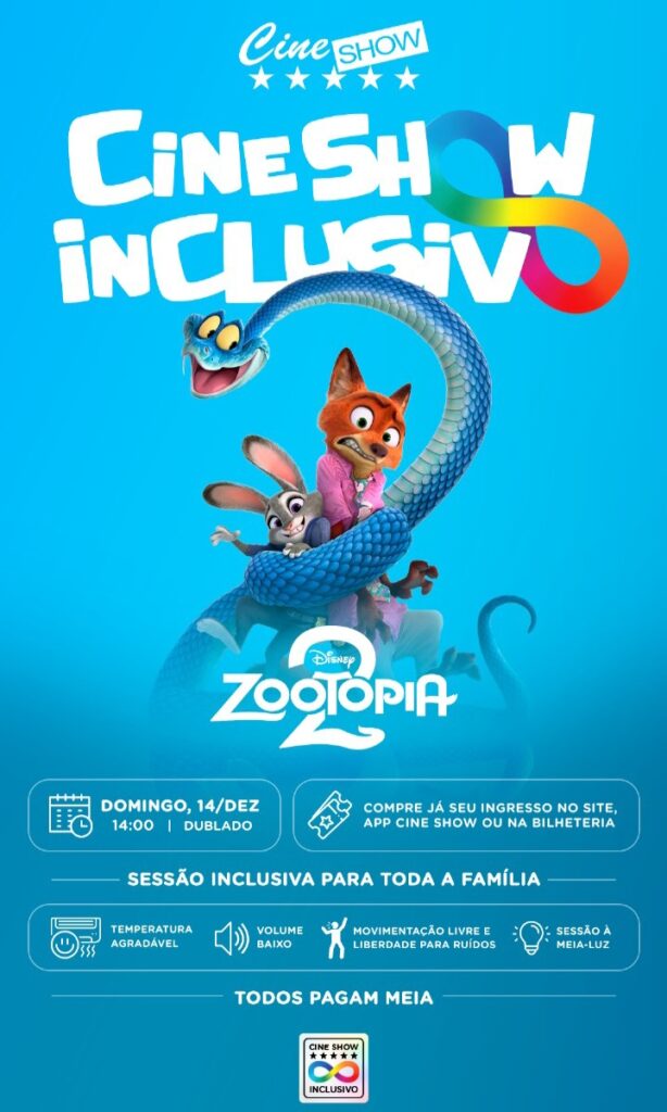 A próxima sessão exibirá o aguardado “Zootopia 2”, com ingressos a meia-entrada para todos, benefício já aplicado automaticamente e sem acumular promoções.